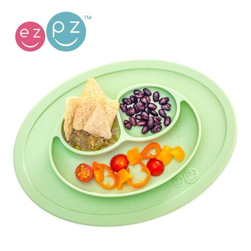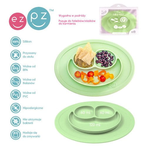 Mini Mat amerykańskiej marki EZPZ to nieduża, poręczna podkładka i trójdzielny talerzyk w jednym, stworzony z najbezpieczniejszego silikonu. Pasuje do większości blatów krzesełek do karmienia. Dzięki zamykanemu opakowaniu, jest to idealne rozwiązanie na podróż.