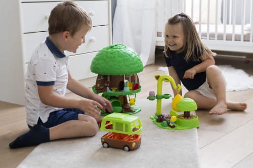 Nowość od producenta Żyrafki Sophie, zestaw Klorofil Magiczne Drzewo zawiera: drzewo domek, 2 zwierzątka, samochodzik, 2 łóżeczka, stolik, 4 krzesła, kanapa, fotel. Montaż zabawki wymagany jest przez osobę dorosłą. Opakowanie zawiera instrukcję. Zabawka dla dzieci w wieku 18 miesięcy +.