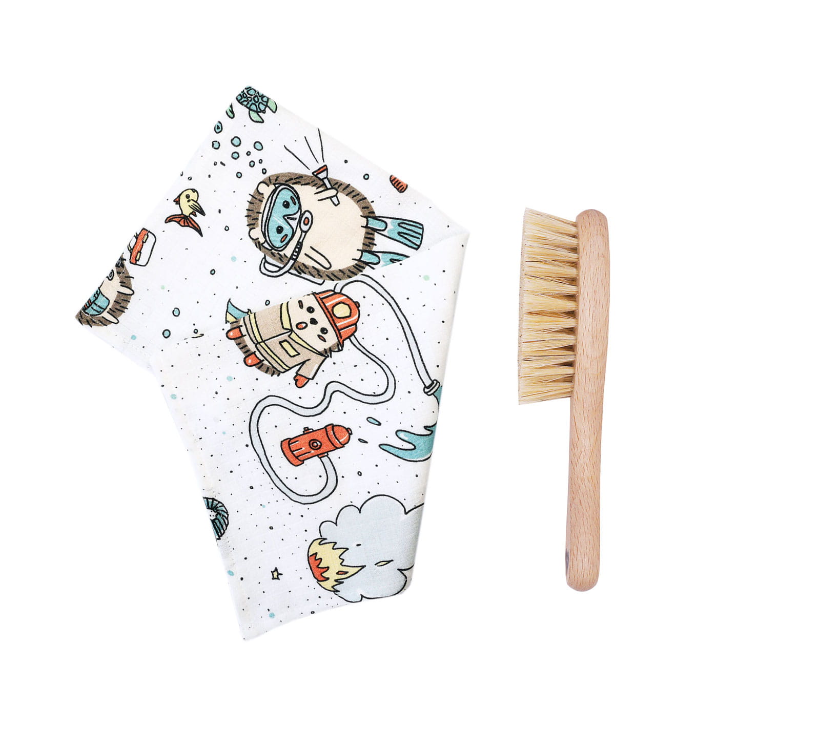 Szczotka dla dzieci i niemowląt z naturalnej szczeciny z drewnianą rączką w zestawie z praktyczną muślinową myjką z kolekcji "Jeże Zawody"..