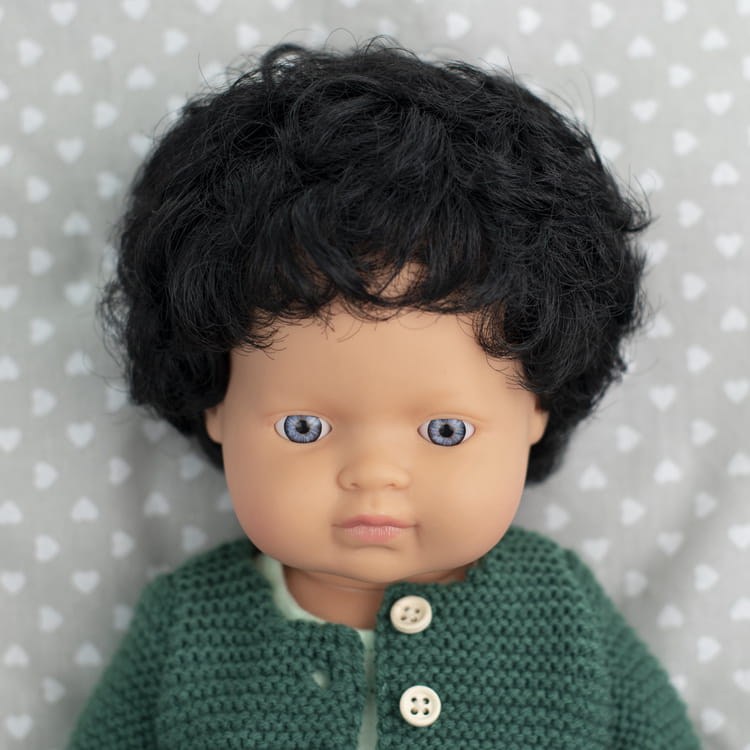 Miniland Lalka chłopiec Europejczyk Czarne Kręcone Włosy |38cm