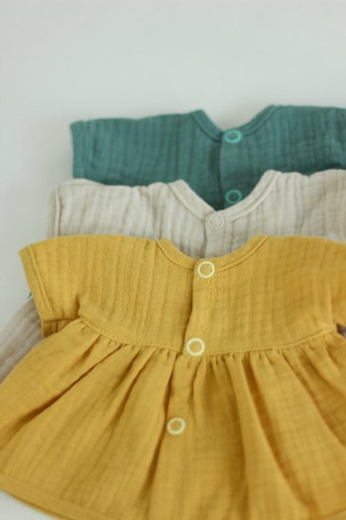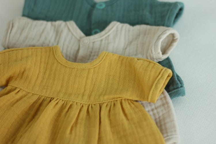 Ręcznie uszyta sukienka z delikatnego muślinu bawełnianego typu double gauze. Ubranko posiada rozcięcie z tyłu na całej długości i zapinane jest na bezpieczne napy. Maluszek ubierając swoją laleczkę będzie dzielnie trenować małą motorykę.